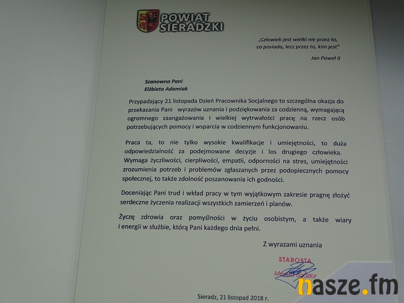 Dziś przypada Dzień Pracownika Socjalnego. W Starostwie Powiatowym w Sieradzu odbyła się uroczystość podczas której starosta i wicestarosta Sieradza, wręczyli podziękowania dla pracowników socjalnych z regionu. Wystąpił też zespół muzyczny z Domu Pomocy Społecznej z Biskupic.