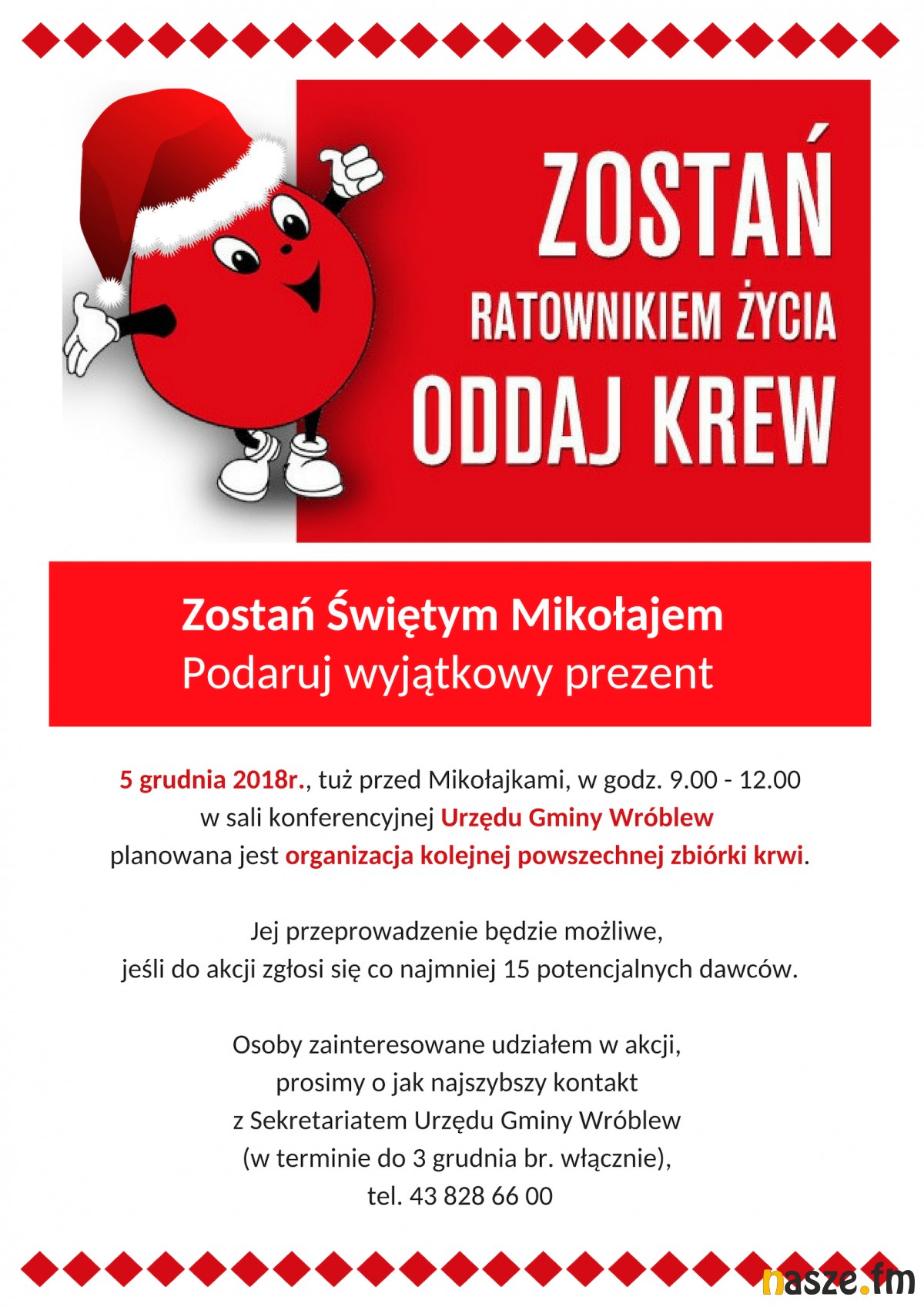 Urząd Gminy Wróblew po raz kolejny przymierza się do zbiórki krwi od honorowych dawców. Zaplanowano ją 5.12.br. w godz. 9-12 w sali konferencyjnej urzędu.