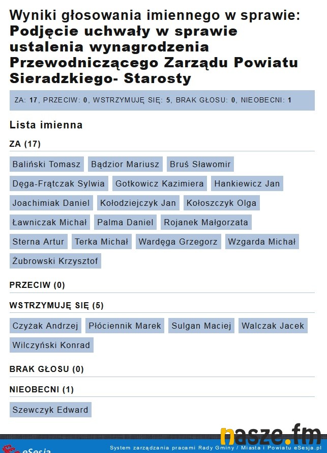 Radni ustalili uchwałą także wynagrodzenie Starosty - od 23 listopada wynosi 10 620 zł. Ta kwota obejmuje: wynagrodzenie zasadnicze (4 800zł), dodatek stażowy (960 zł), dodatek funkcyjny (2 100 zł), dodatek specjalny (2 760 zł).