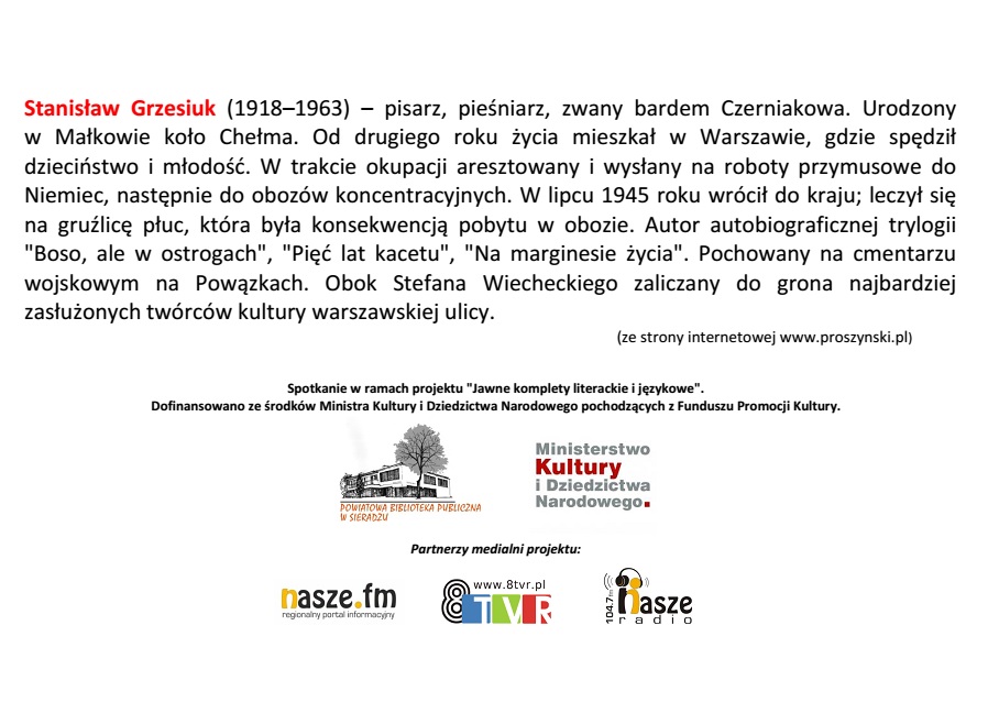 O pisarzu i bardzie Czerniakowa opowie Michał Nalewski - redaktor prowadzący wznowień książek S. Grzesiuka. Początek spotkania o godz. 18:00, wstęp wolny.