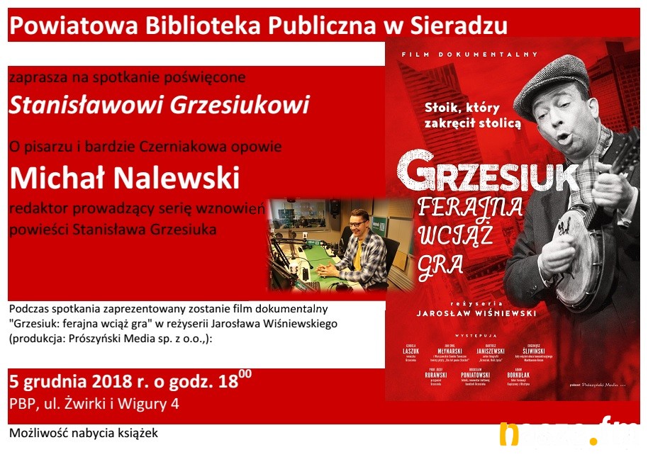 Powiatowa Biblioteka Publiczna w Sieradzu zaprasza w środę 5 grudnia na spotkanie poświęcone Stanisławowi Grzesiukowi. W książnicy zostanie zaprezentowany film dokumentalny "Grzesiuk: ferajna wciąż gra" w reżyserii Jarosława Wiśniewskiego.