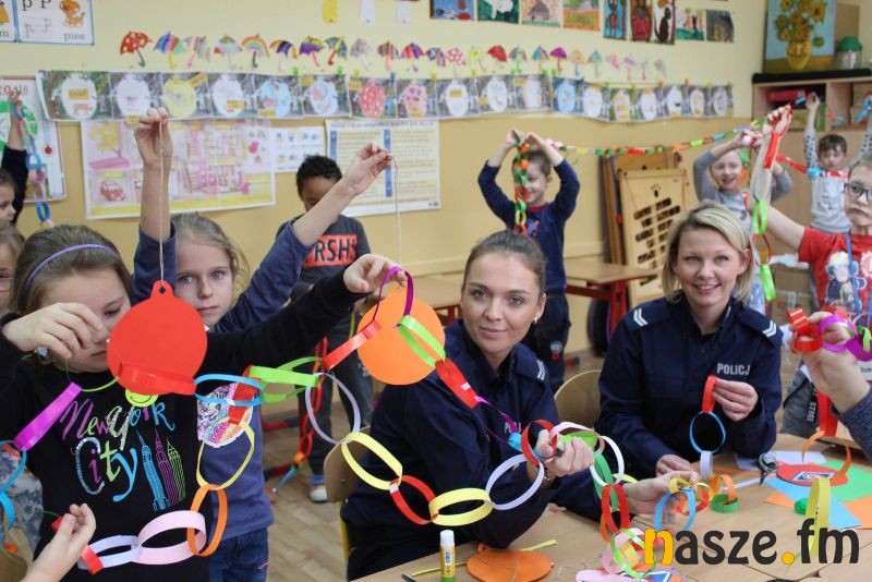 Wczoraj uczniowie klasy pierwszej Szkoły Podstawowej nr 11 wraz z policjantkami wykonali ozdoby świąteczne na choinkę. Jak pokazuje doświadczenie, dzieci najlepiej uczą się poprzez zabawę. Dlatego st. sierż Kamila Sowińska zadając dzieciom pytania z zakresu wiedzy o bezpieczeństwie przypominała im, jak należy zachowywać się w rejonie przejść dla pieszych oraz przy przechodzeniu przez jezdnię. Uczyła także jak bezpiecznie podróżować z rodziną samochodem i jak ważne są odblaski noszone przez pieszych.