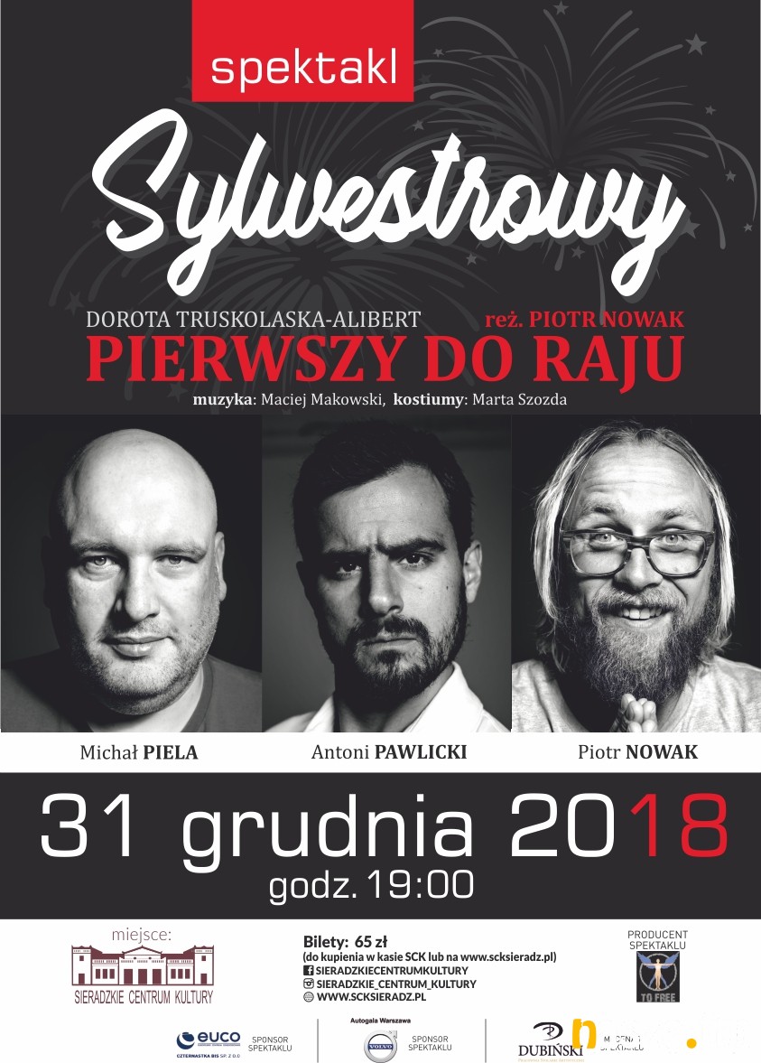 Sieradzanie w tym roku nie mogą liczyć Sylwestra pod gwiazdami, mogą za to wybrać się do teatru. 31 grudnia w Sieradzkim Centrum Kultury o 19 rozpocznie się spektakl "Pierwszy do raju". Na scenie wystąpią Michał Piela, Antoni Pawlicki i Piotr Nowak. Bilety można zakupić w kasie SCK.