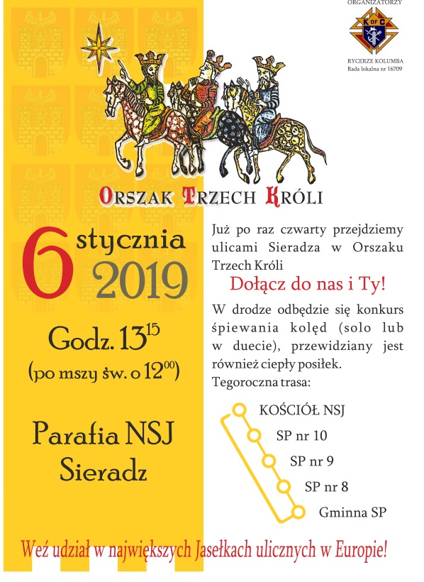 - W Sieradzu Orszak Trzech Króli organizujemy po raz czwarty. Trasa jest taka jak roku poprzednim. Zaczynamy pod kościołem NSJ na ulicy Grunwaldzkiej, nastepnie ulica Reymonta, Braterstwa Broni, Bohaterów Września, Armii Krajowej i wracamy do kościoła NSJ. Wymarsz zaraz po mszy św. o 12, czyli ok 13:15. W drodze odbędzie się konkurs śpiewania kolęd na ruchomej platformie. Uczestnikami konkursu są dzieci ze szkół podstawowych na terenie parafii. Na zakończenie orszaku przewidziano ciepły posiłek dla uczestników- mówi Krzysztof Halczyński, jeden z organizatorów Orszaku