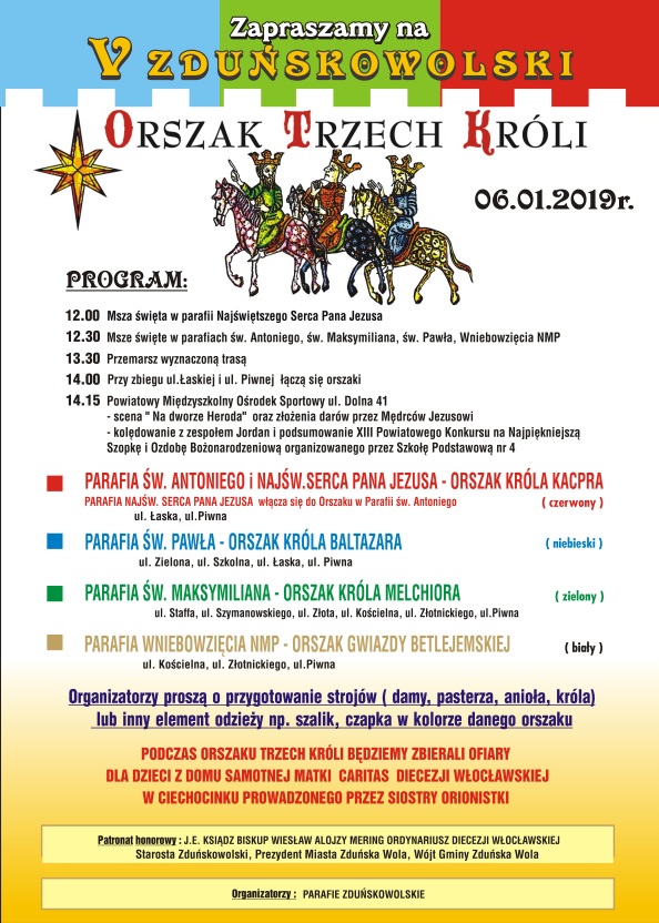 - Zduńskowolski Orszak odbędzie się po raz piąty. Tegoroczne hasło to " Odnowi oblicze ziemi". Orszaki o godz. 13:30 tradycyjnie wyruszą z poszczególnych parafii, a następnie u zbiegu Łaskiej i Piwnej połączą się w jeden wielki orszak, który uda się na teren PMOS-u przy ulicy Dolnej. Zachęcamy Zduńskowolan aby przygotowali stroje w kolorach poszczególnych orszaków. Te kolory mówią o kontynentach, z którymi się jednoczymy- zapowiada ks. Andrzej Jaworski, proboszcz parafii św. Pawła w Zduńskiej Woli