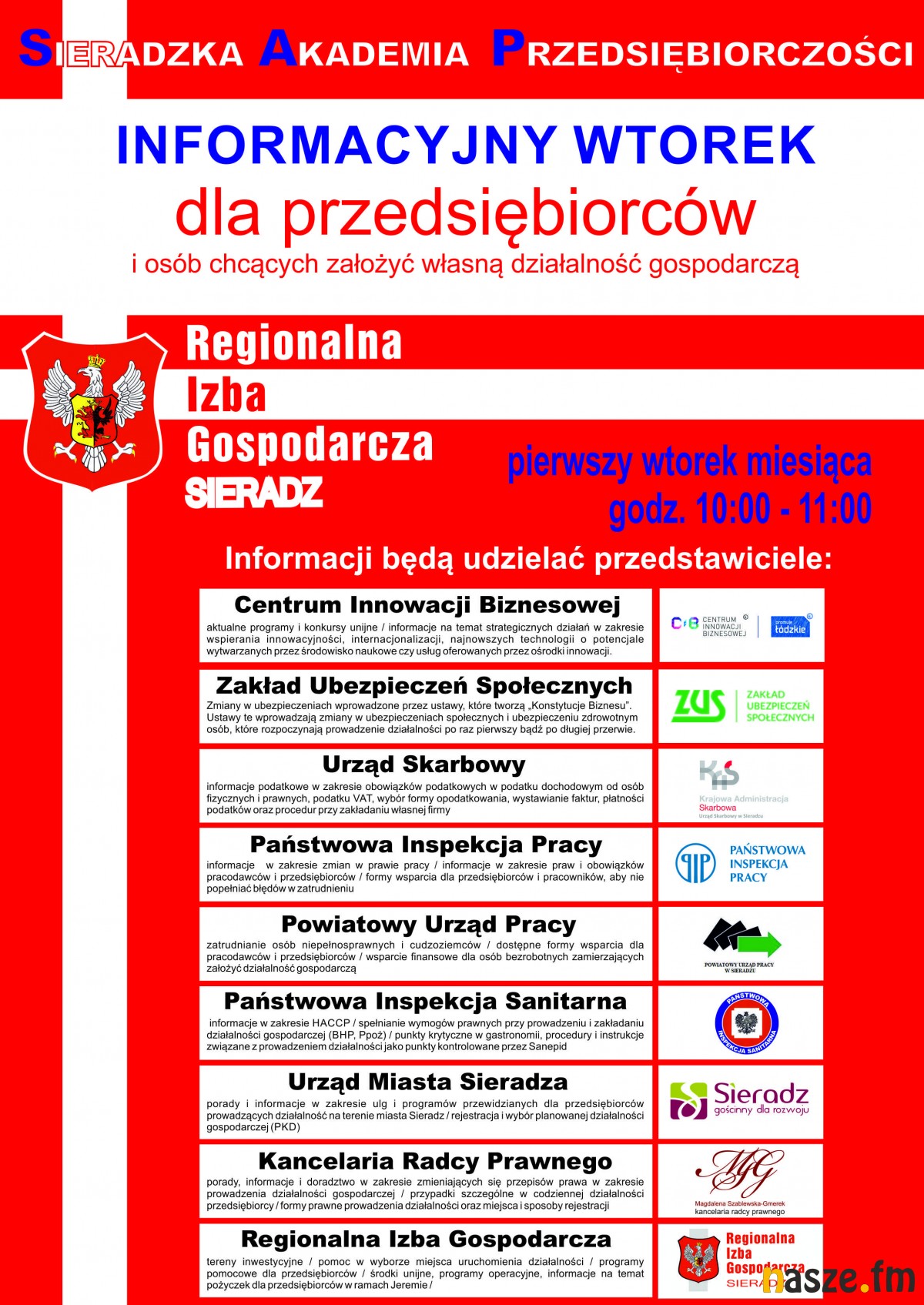 Urząd Skarbowy w Sieradzu - informacje podatkowe w zakresie obowiązków podatkowych w podatku dochodowym od osób fizycznych i prawnych, podatku VAT, wybór formy opodatkowania, wystawianie faktur, płatności podatków oraz procedur przy zakładaniu własnej firmy. Zakład Ubezpieczeń Społecznych - preferencyjne zasady opłacania składek ZUS, ustawy obniżającej wiek emerytalny, zmian w ubezpieczeniach społecznych od 1.1.2018 r. dla przedsiębiorców, korzyści płynące z korzystania z Platformy Usług Elektronicznych (PUE). Państwowa Inspekcja Pracy - informacje w zakresie zmian w prawie pracy / informacje w zakresie praw i obowiązków pracodawców i przedsiębiorców / formy wsparcia dla przedsiębiorców i pracowników, aby nie popełniać błędów w zatrudnieniu.