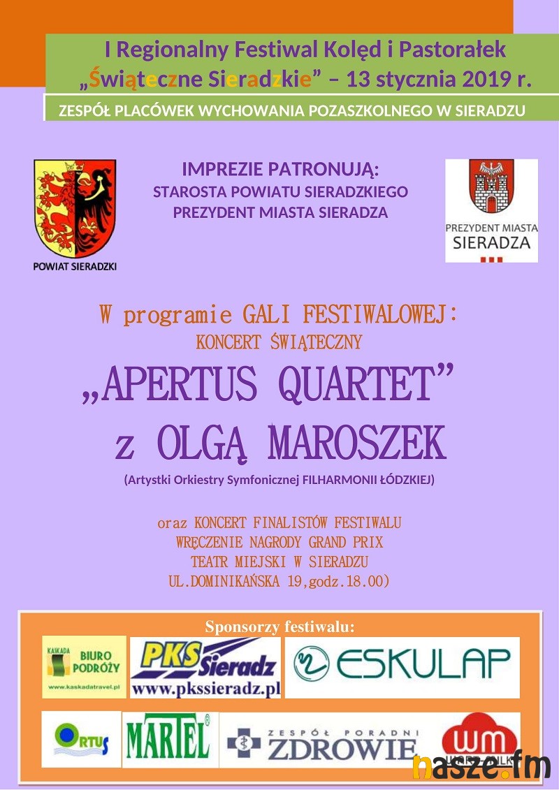 Zespół Placówek Wychowania Pozaszkolnego w Sieradzu zaprasza 13 stycznia na I Regionalny Festiwal Kolęd i Pastorałek "Świąteczne Sieradzkie". Gwiazdą wieczoru będzie Apertus Quartet z solistką Olgą Maroszek.