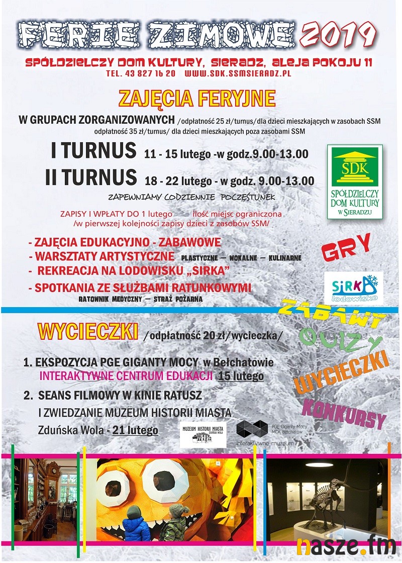 Spółdzielczy Dom Kultury w Sieradzu zaprasza na wspólne spędzenie ferii zimowych. Placówka oferuje dwa turnusy : od 11 do 15 lutego oraz od 18 do 22 lutego. W programie zajęcia edukacyjne, zabawy, konkursy, warsztaty artystyczne i wycieczki. Szczegóły na plakacie.