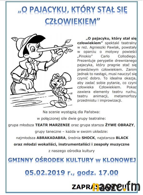 Gminny Ośrodek Kultury w Klonowej zaprasza 5 lutego na spektakl teatralny "O pajacyku, który stał się człowiekiem". Na scenie wystąpią grupy teatralne, taneczne, wokaliści, instrumentaliści i zespoły muzyczne.