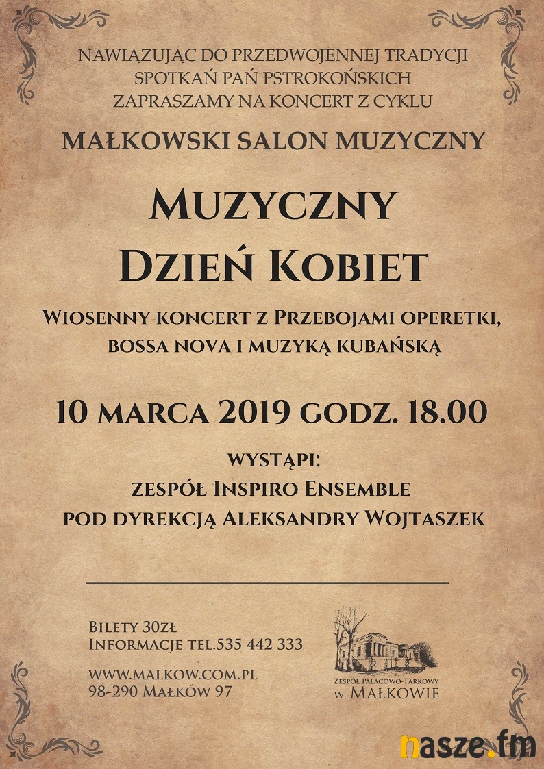W pałacu w tej miejscowości w niedzielę 10 marca wystąpi zespół z Poznania pod dyrekcją Aleksandry Wojtaszek. W programie hity operetkowe, pieśni, ale zabrzmi też bossa nova czy gorąca muzyka kubańska. - To będzie koncert specjalnie z okazji Dnia Kobiet, ale każdy znajdzie coś dla siebie - zapowiada Agnieszka Kudlik - Budzińska, właścicielka małkowskiego pałacu.