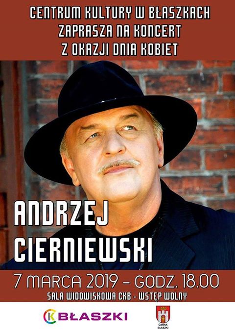 Z okazji Dnia Kobiet, już w czwartek w Błaszkach zabrzmi muzyka. 7 marca o godz. 18.00 na sali widowiskowej Centrum Kultury w Błaszkach wystąpi twórca takich hitów jak „Dwie morgi słońca” czy "Słodka Karolina", obdarzony silnym, ciepłym charakterystycznym głosem – Andrzej Cierniewski. Wstęp na koncert jest bezpłatny.