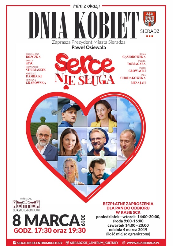 W piątek do kina zapraszają prezydent Sieradza i Sieradzkie Centrum Kultury. W Kinie Teatr wyświetlony zostanie film "Serce nie sługa". Bezpłatne zaproszenia dla pań będzie można dziś od 14 odbierać w kasie kina. Organizatorzy zastrzegają, że ilość miejsc na to wydarzenie jest ograniczona. Na piątek zaplanowano dwa seanse o 17:30 i 19:30.
