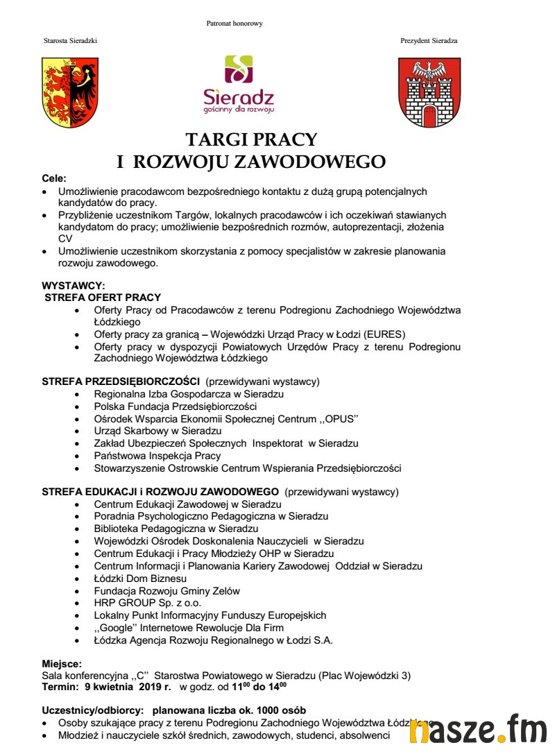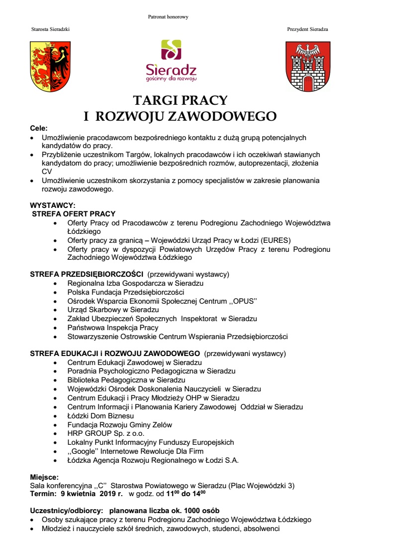 Targi odbędą się 9 kwietnia od 11 do 14 w sali C Starostwa Powiatowego w Sieradzu.