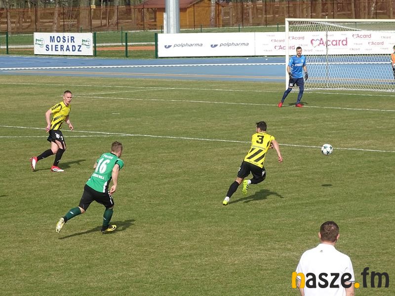 Pierwsza bardzo groźna sytuacja miała miejsce w 3.minucie. Z bliska strzelał Wiktor Płaneta. Bramkarz Pogoni, Jakub Piotrowski odbił ten strzał. Z dobitki uderzył Adam Patora, ale i tym razem piłka nie znalazła drogi do bramki. Kolejne minuty to dominacja sieradzkiej Warty. Dwukrotnie bliski trafienia był Przemysław Nawrocki, który w 26 i 32 minucie strzelił tuż obok bramki. Gospodarze podkręcili tempo. W 36 minucie Adam Patora strzelił tuż nad bramką. Gol padł dopiero w doliczonym czasie gry pierwszej połowy. Z lewego skrzydła uderzał Nawrocki. Bramkarz Pogoni odbił ten strzał i futbolówka wpadła tuż pod nogi Patory, któremu pozostało już tylko posłać piłkę do pustej bramki.