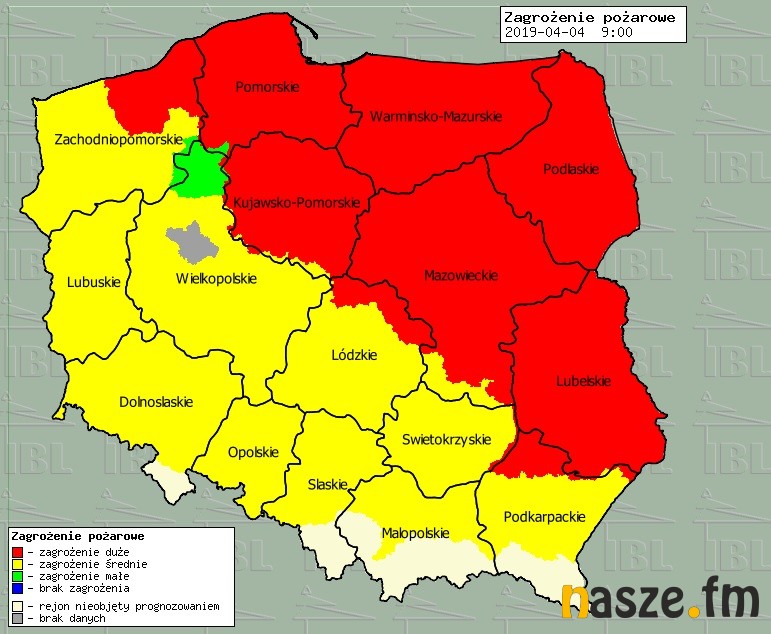 Zgodnie z mapami Instytutu Badawczego Leśnictwa średnie zagrożenie pożarowe występuje w większości lasów na terenie kraju. Należy pamiętać, że w lasach i na terenach śródleśnych, na obszarze łąk i torfowisk, ale też w odległości 100 m od granicy lasu zabronione jest rozniecanie ognia. Nie można także wypalać wierzchniej warstwy gleby, ani pozostałości roślinnych. Poza wyznaczonymi miejscami obowiązuje także zakaz palenia tytoniu.