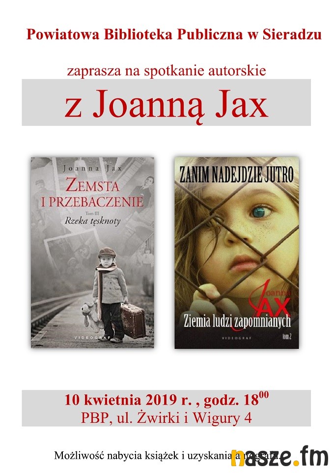 Powiatowa Biblioteka Publiczna w Sieradzu zaprasza w środę 10 kwietnia na spotkanie z Joanną Jax. To autorka "Dziedzictwa von Becków" czy "Długiej drogi do domu" Początek o godz. 18:00, wstęp wolny.