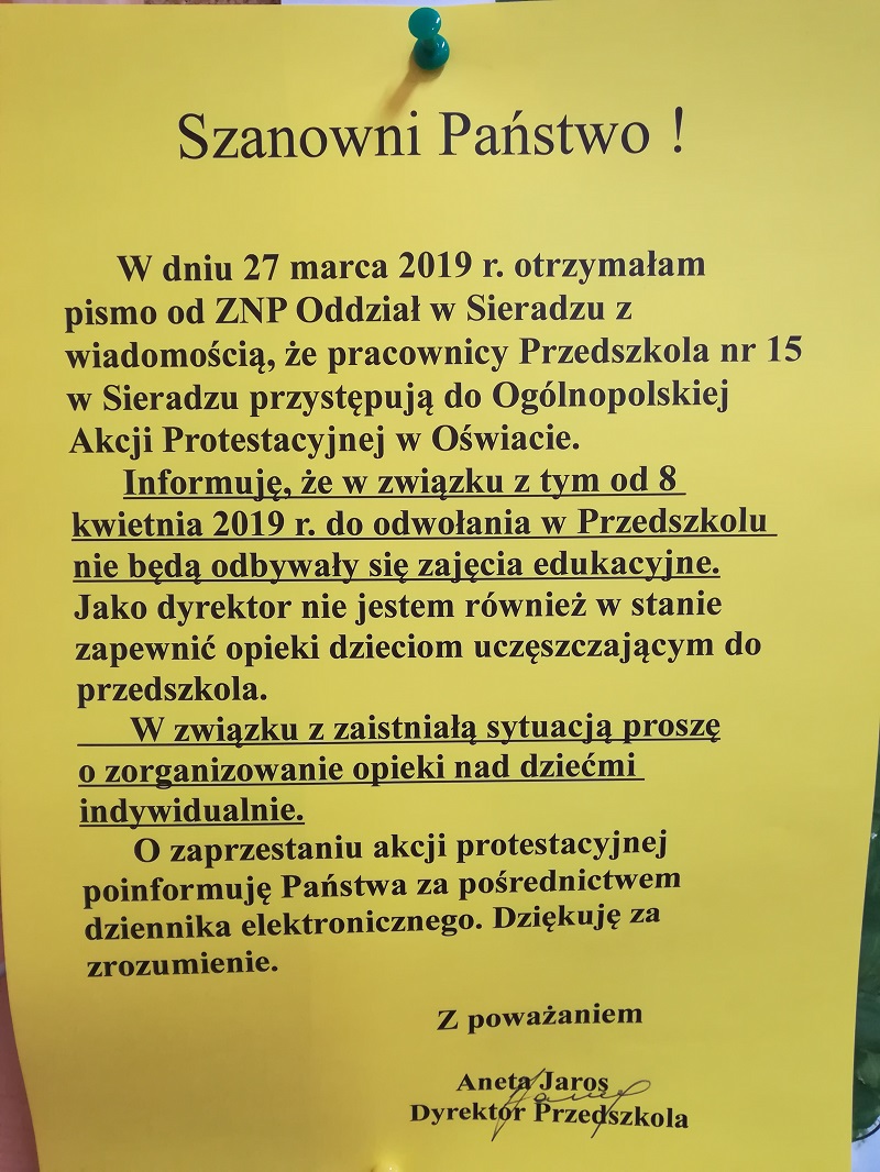 Rafała Matysiaka zapytaliśmy też o sytuację w Przedszkolu nr 15 w Sieradzu. Tam rodzice zastali na drzwiach placówki informację następującej treści: