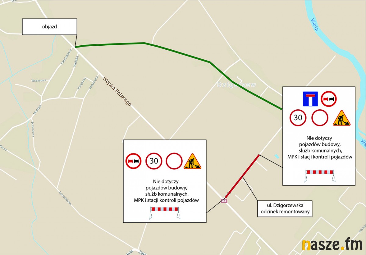 Prace na ul. Dzigorzewskej będą prowadzone "połówkowo". Dojazd do przedsiębiorstw zlokalizowanych przy ul. Dzigorzewskej będzie możliwy jak dotychczas od strony ul. Wojska Polskiego, natomiast wyjazd odbywać się będzie prze miejscowość Dzigorzew.