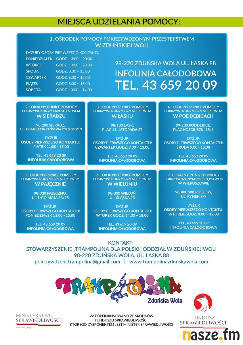 Okręgowy Ośrodek Pomocy Pokrzywdzonym Przestępstwem, który powstał w Zduńskiej Woli jest współfinansowany ze środków Funduszu Sprawiedliwości, którego dysponentem jest Minister Sprawiedliwości.