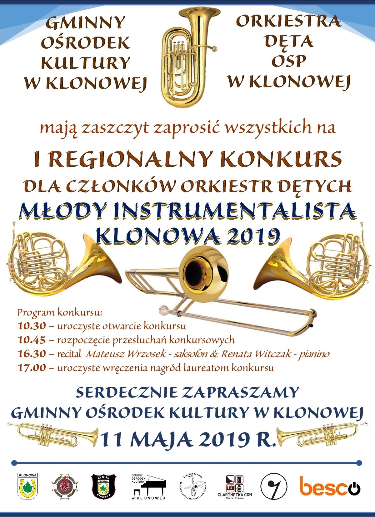 W sobotę 11 maja w Gminnym Ośrodku Kultury Klonowej o godz. 10:30 rozpoczną się przesłuchania w ramach I Regionalnego Konkursu dla Członków Orkiestr Dętych - "Młody Instrumentalista" Klonowa 2019.