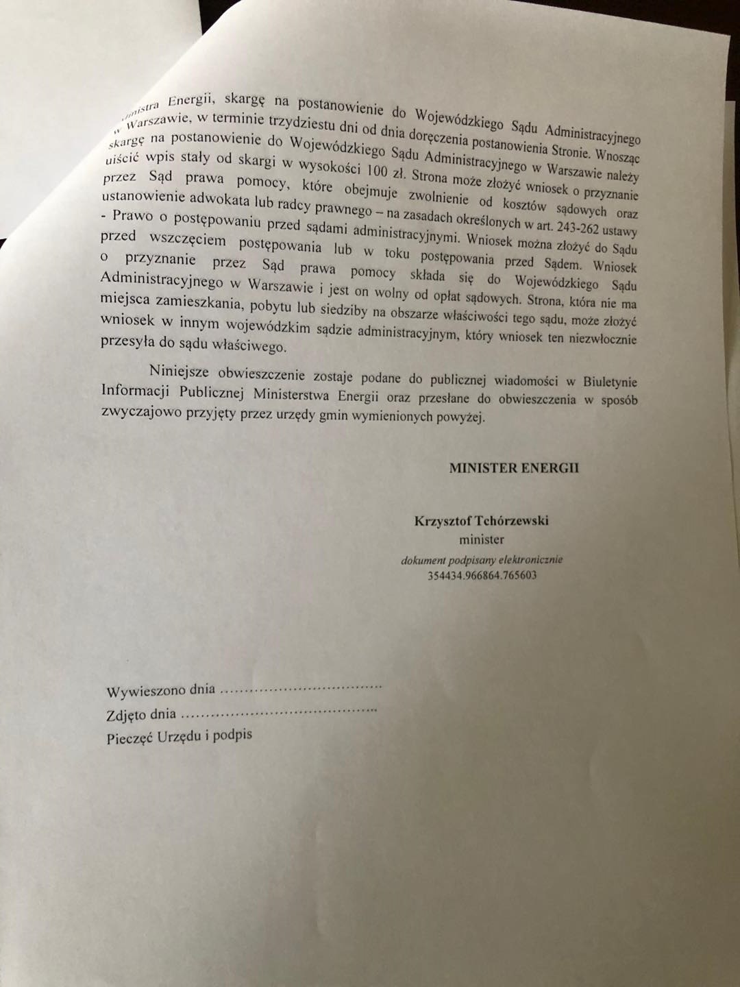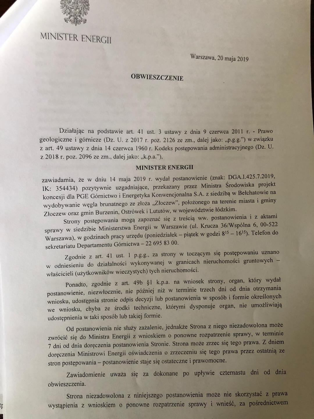 Poniżej publikujemy treść obwieszczenia Ministra Energii w sprawie odkrywki Złoczew.