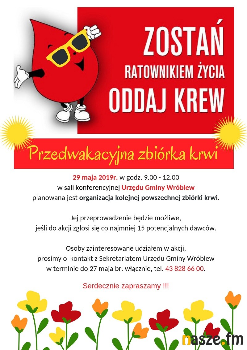 Aby zbiórka mogła się odbyć potrzebna jest jednak wcześniejsza deklaracja co najmniej 15-tu potencjalnych dawców. Kontakt z sekretariatem wróblewskiego magistratu w tej sprawie do 27. maja br. do godz. 15. Krew może oddać zdrowa i pełnoletnia osoba. W dniu zbiórki płynu życia należy pamiętać o dowodzie osobistym.