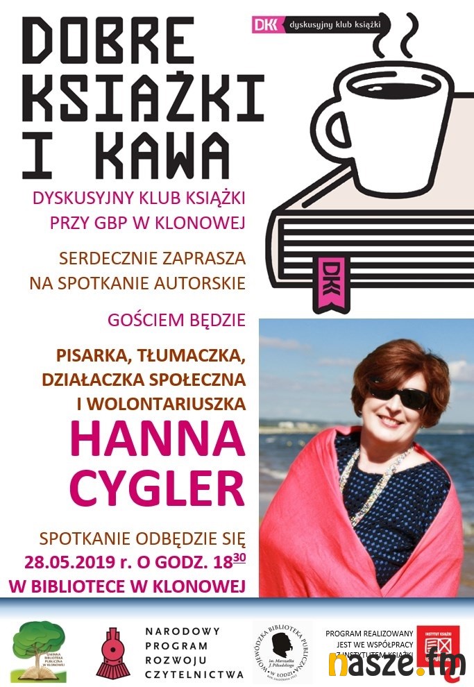 Gminna Biblioteka Publiczna w Klonowej zaprasza jutro na spotkanie autorskie z Hanną Cygler. To pisarka, działaczka społeczna i wolontariuszka. Spotkanie odbędzie się w ramach Dyskusyjnego Klubu Książki i Programu Operacyjnego "Promocja Czytelnictwa" .