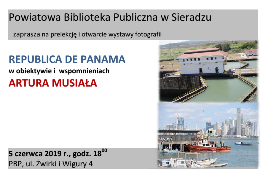 Powiatowa Biblioteka Publiczna w Sieradzu zaprasza jutro na prelekcję i otwarcie wystawy fotografii "Republica de Panama w obiektywie i wspomnieniach Artura Musiała". Początek o godz. 18:00, wstęp wolny.
