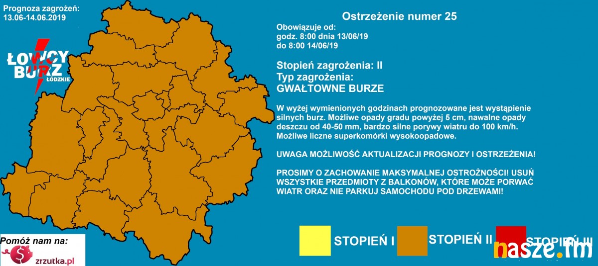 Aktualizacja: Ostrzeżenie wydało także Wojewódzkie Centrum Zarządzania Kryzysowego - od godz. 15:00 dnia 13.06.2019 do godz. 06:00 dnia 14.06.2019 prognozuje się wystąpienie burz z opadami deszczu miejscami od 30 mm do 50 mm z porywami wiatru do 115 km/h. Miejscami grad. Prawdopodobieństwo 85 %. Dotyczy całego województwa łódzkiego.