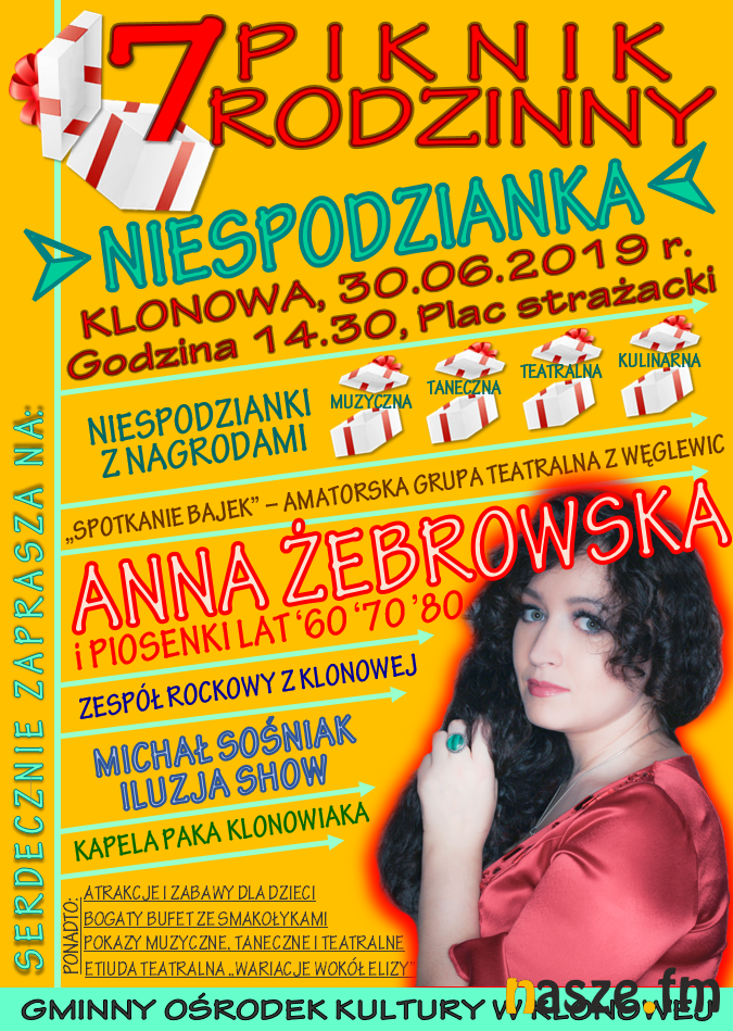 Gminny Ośrodek Kultury w Klonowej zaprasza 30 czerwca na 7 Piknik Rodzinny. W programie występy muzyczne, atrakcje i zabawy dla dzieci oraz niespodzianki z nagrodami. Gwiazdą wieczoru będzie Anna Żebrowska, która zaśpiewa piosenki z lat '60'70'80.