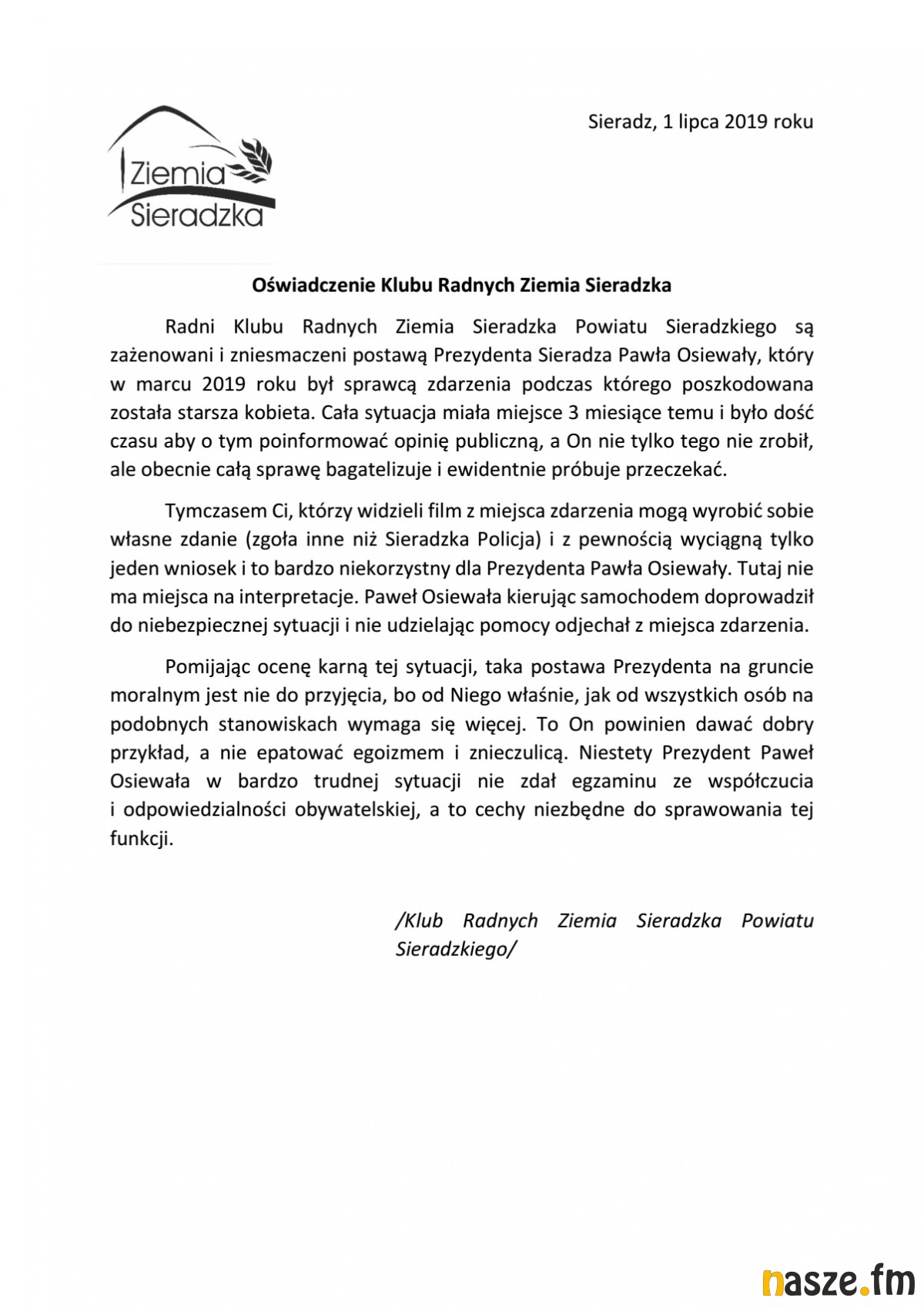 W marcu tego roku na parkingu przed sieradzką galerią, prezydent Sieradza potrącił staruszkę i odjechał z miejsca zdarzenia. Policja zakwalifikowała to jako kolizję i wystawiła mandat na 300 zł. Wywołało to poruszenie wśród polityków, ale też mieszkańców. Na wczorajszej konferencji prasowej Paweł Osiewała zadeklarował, że nie poda się do dymisji. Temat skomentowały też kolejne środowiska polityczne.
