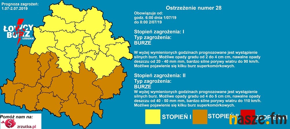 Ważność od godz. 14:00 dnia 30.06.2019 do godz. 20:00 dnia 01.07.2019, prawdopodobieństwo wystąpienia wynosi 90 proc.