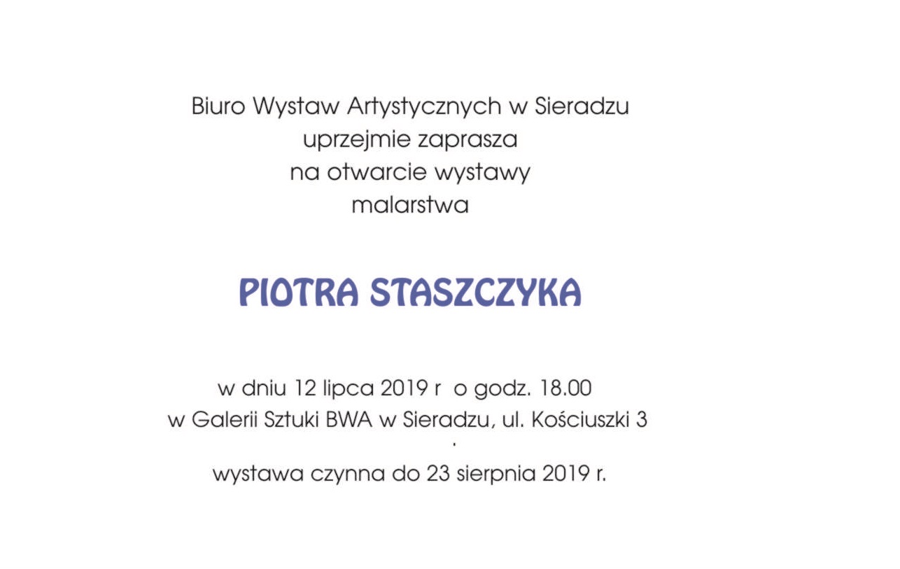 W Biurze Wystaw Artystycznych w Sieradzu zostanie jutro otwarta wystawa malarstwa Piotra Staszczyka. - Miałam nadzieję, że ta wystawa będzie miała charakter wakacyjny i ma. Wiąże się z pejzażem, jego urodą, z przestrzenią, ciszą i spokojem, czyli z tym czego na wakacje najbardziej potrzebujemy - zapowiada Małgorzata Szymlet - Piotrowska, dyrektor BWA w Sieradzu. Otwarcie wystawy zaplanowano na godz. 18:00.