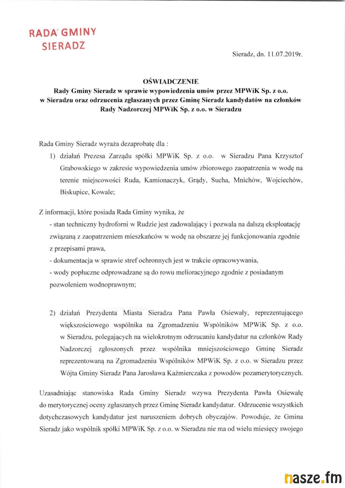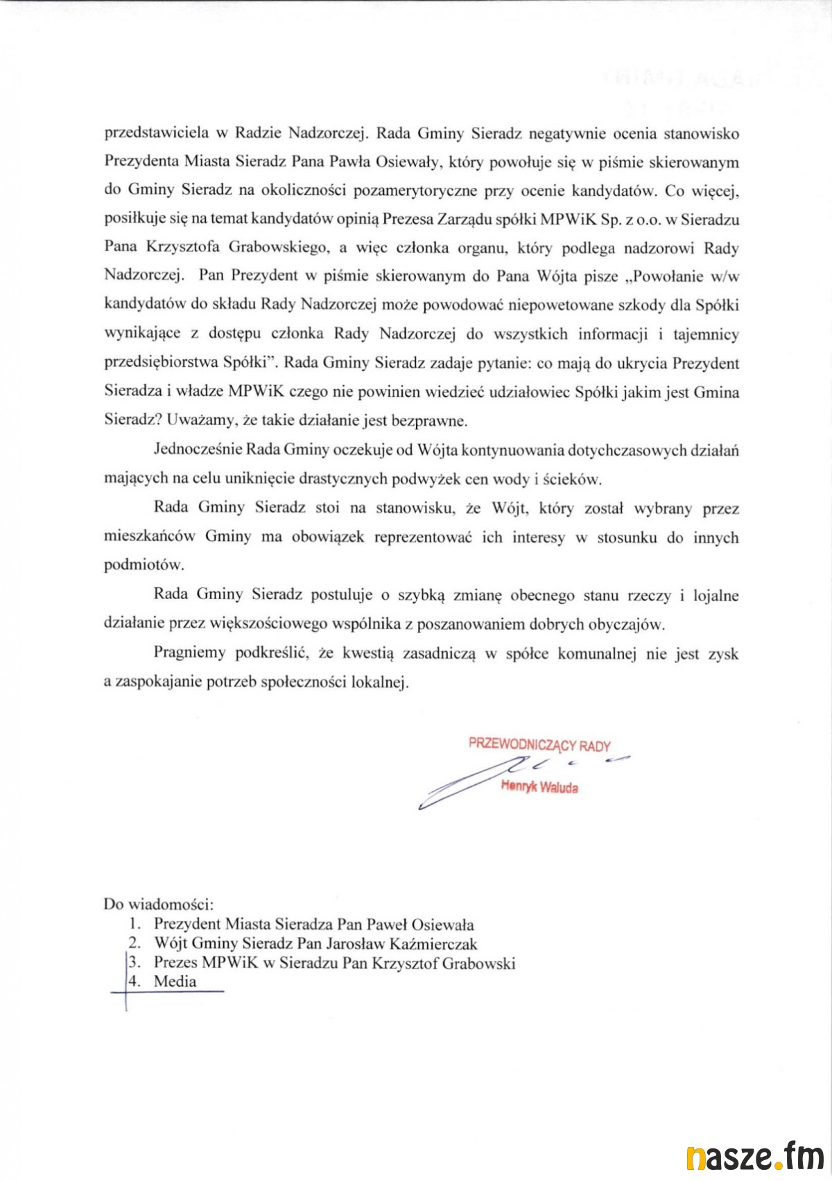 W efekcie wypowiedzenia umowy oficjalne stanowisko Rady Gminy Sieradz przedstawił przewodniczący Henryk Waluda. Podnosi w nim dwa zarzuty - pod adresem prezesa MPWiK-u i prezydenta Sieradza: