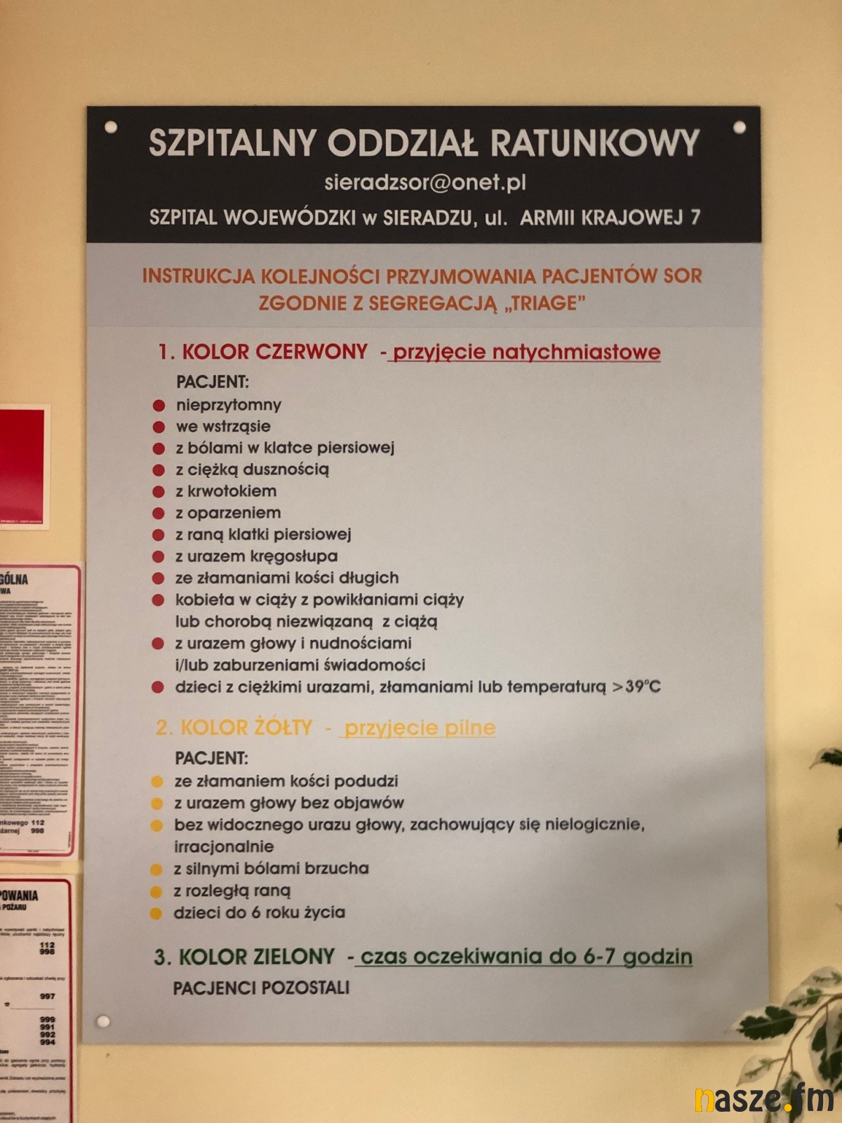 Rozporządzenie Ministra Zdrowia z dnia 27 czerwca 2019r, w sprawie Szpitalnego Oddziału Ratunkowego, które weszło w życie 1 lipca ujednolica sposób rejestracji i segregacji medycznej na Szpitalnych Oddziałach Ratunkowych na terenie całego kraju. Jak ustaliliśmy dla mieszkańców Sieradza i okolic tak zwany "Triage" nie jest niczym nowym. SOR przy Szpitalu Wojewódzkim im. Prymasa Kardynała Stefana Wyszyńskiego z systemu segregacji pacjentów korzysta już od dawna.