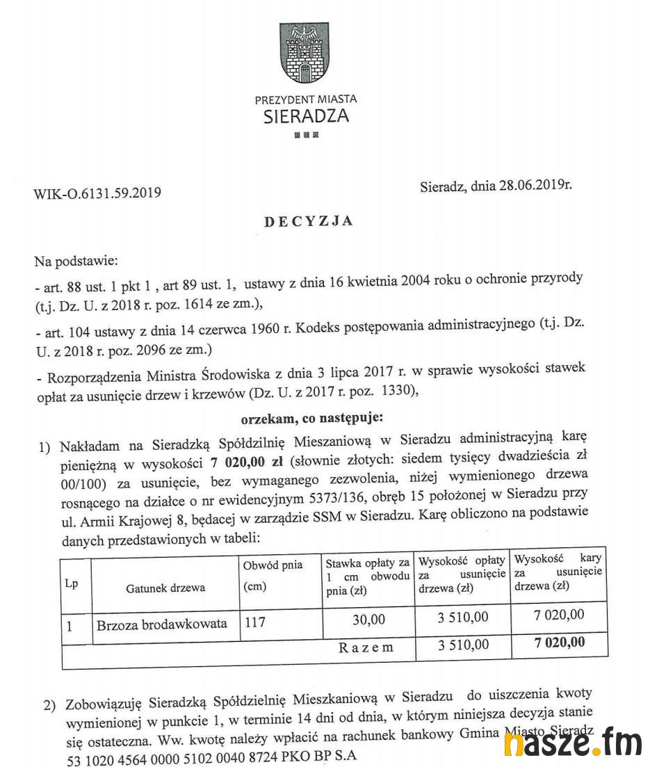 Kilka dni temu, do naszej redakcji zgłosił się pan Przemysław, zaniepokojony karą, jaką Urząd Miasta Sieradza nałożył na Sieradzką Spółdzielnię Mieszkaniową. Sprawa dotyczy wyciętego bez niezbędnej zgody drzewa. Za taką samowolkę SSM musi teraz zapłacić ponad 7 tys. złotych. Czy odbije się to na mieszkańcach?