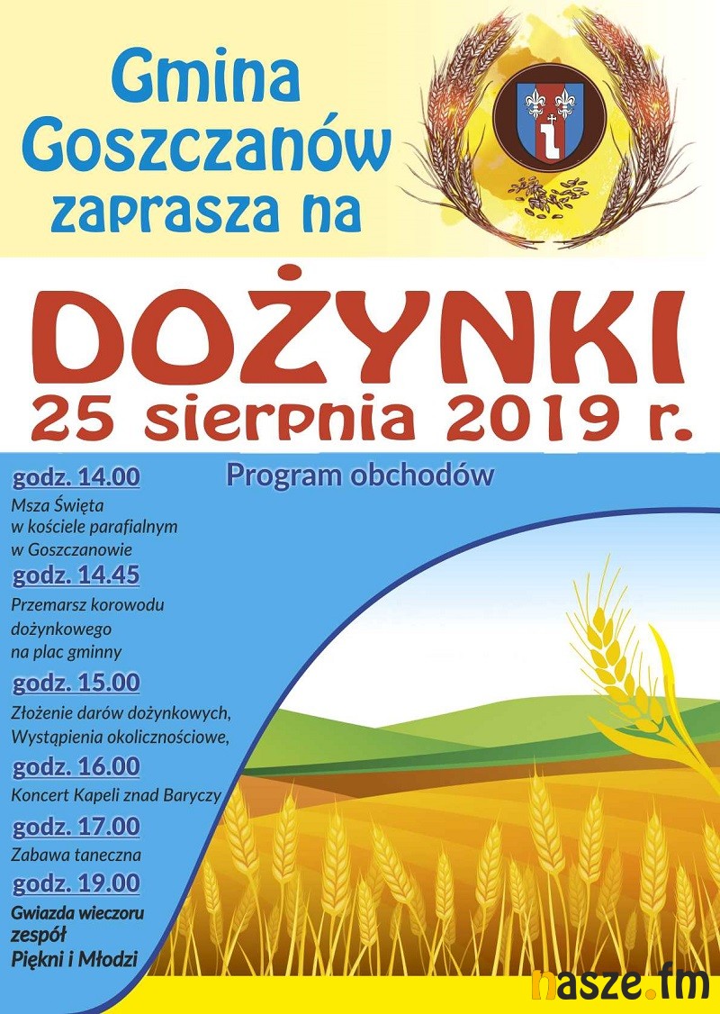 25 sierpnia w Goszczanowie odbędą się dożynki gminne. W programie przemarsz korowodu dożynkowego, złożenie darów i koncerty zespołów. Gwiazdą wieczoru będzie zespół Piękni i Młodzi.