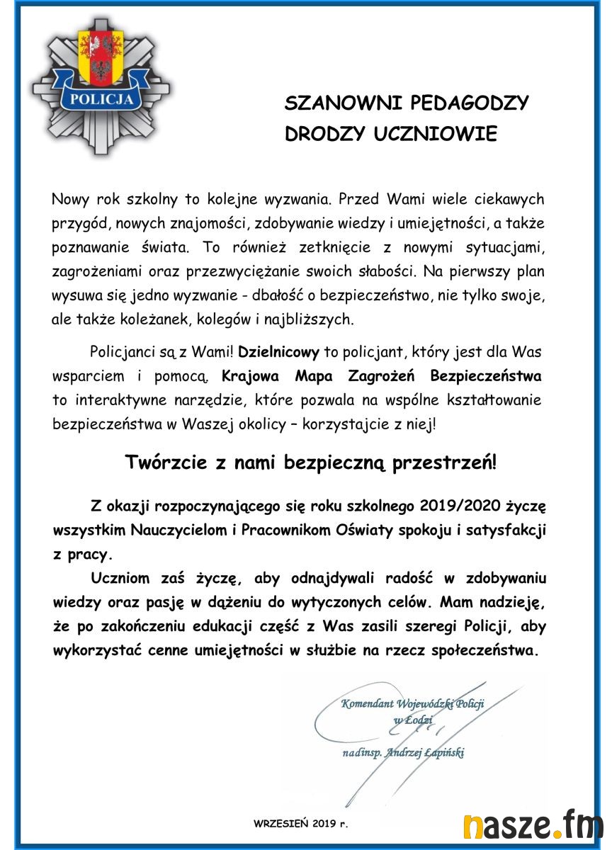 Podczas uroczystych inauguracji rozpoczęcia nowego roku szkolnego policjanci w szkołach powiatu zduńskowolskiego przekazali dyrektorom szkół list Komendanta Wojewódzkiego Policji w Łodzi nadinsp. Andrzeja Łapińskiego skierowany do uczniów i pedagogów zachęcający do wspólnego kształtowania bezpieczeństwa, m.in. przy wykorzystaniu Krajowej Mapy Zagrożenia Bezpieczeństwa.