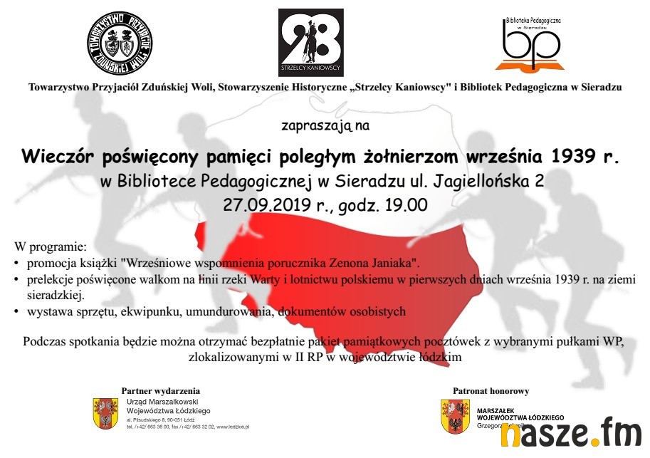 W piątek o godz. 19.00 w siedzibie Biblioteki Pedagogicznej w Sieradzu przy ul. Jagiellońskiej 2 rozpocznie się wieczór poświęcony pamięci poległym żołnierzom września 1939 r. połączony z wystawą czasową zbiorów Stowarzyszenia Historycznego "Strzelcy Kaniowscy".