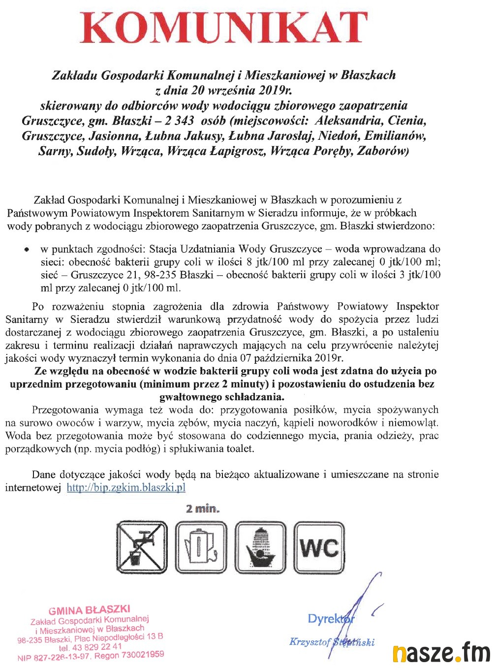 Zakład Gospodarki Komunalnej i Mieszkaniowej w Błaszkach wydał komunikat dotyczący zbiorowego zaopatrzenia w wodę. W Stacji Uzdatniania Wody w Gruszczycach wykryto bakterie grupy coli.
