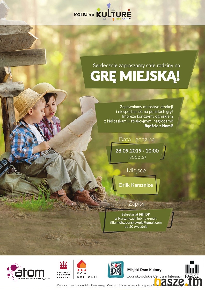 Gra miejska odbędzie się w godzinach 10:00 - 12:30 (zbiórka na boisku Orlik). Udział jest bezpłatny. Przewidziano również nagrody. Pozostało jeszcze kilka wolnych miejsc. Osoby zainteresowane udziałem proszone są o kontakt z filią Miejskiego Domu Kultury w Karsznicach.