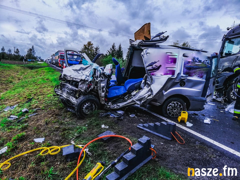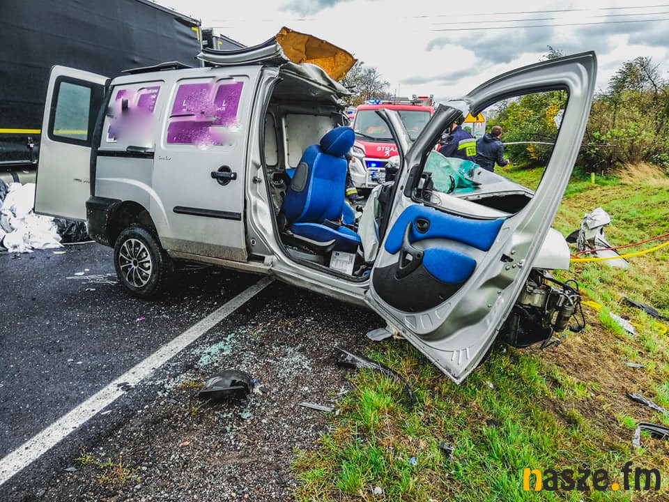 Przed godz. 16 w kierujący samochodem marki Fiat Doblo z nieustalonych przyczyn zjechał na przeciwległy pas ruchu i doprowadził do czołowego zderzenia z ciężarówką z naczepą marki Mercedes.