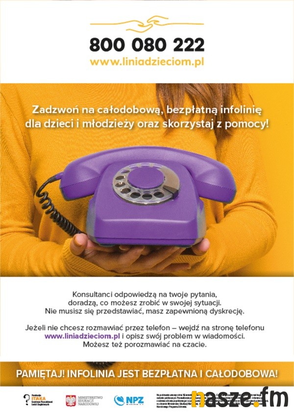 Od 1 października działa całodobowa bezpłatna infolinia dla dzieci, młodzieży, rodziców i nauczycieli. Każda młoda osoba, która zechce porozmawiać o swoich problemach, może zadzwonić pod bezpłatny numer 800 080 222 i uzyskać pomoc od doświadczonych psychologów, pedagogów i prawników.