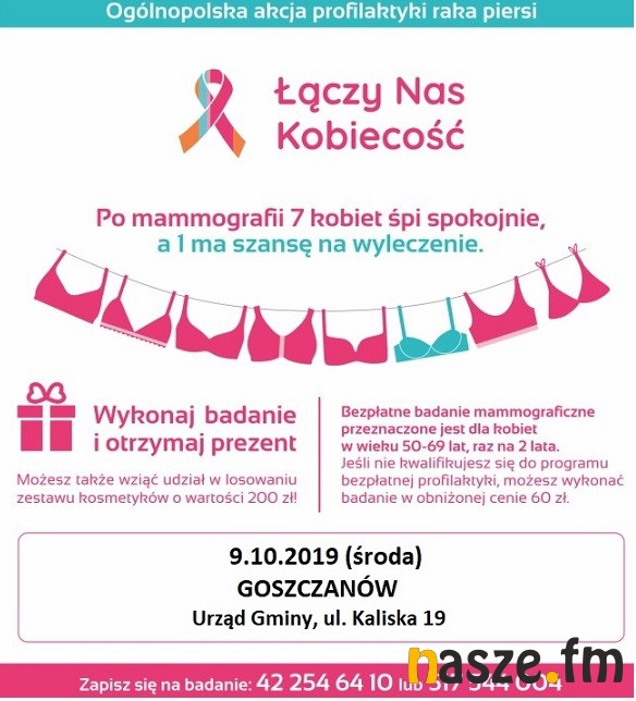 Dziś w Goszczanowie będzie można wykonać bezpłatne badania. To w ramach Ogólnopolskiej Akcji Profilaktyki Raka Piersi. Program skierowany jest do kobiet w wieku od 50 do 69 roku życia, które w ciągu ostatnich 2 lat nie korzystały z bezpłatnej mammografii.