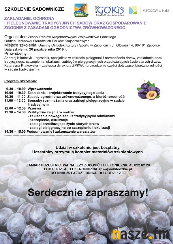 Gminny Ośrodek Kultury i Sporty w Zapolicach zaprasza do udziału w bezpłatnym szkoleniu sadowniczym. Odbędzie się ono w sobotę, 26 października.