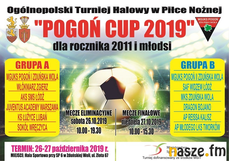 W ten weekend w hali sportowej Szkoły Podstawowej nr 6 w Zduńskiej Woli odbędzie się Ogólnopolski Turniej Halowy w piłce nożnej "POGOŃ CUP 2019" dla rocznika 2011 i młodszych.