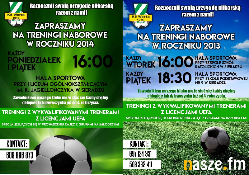 Warta Sieradz ogłasza nabór do drużyny piłkarskiej dla roczników 2013 i 2014. Treningi poprowadzą wykwalifikowani trenerzy z licencjami UEFA.