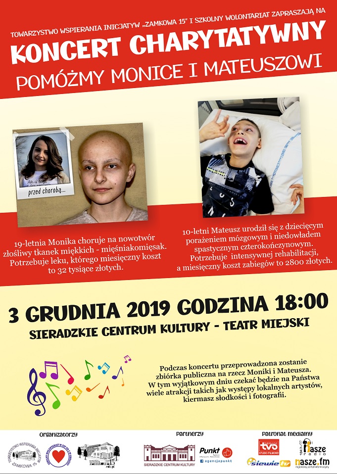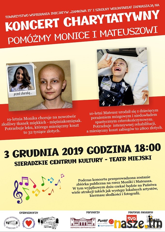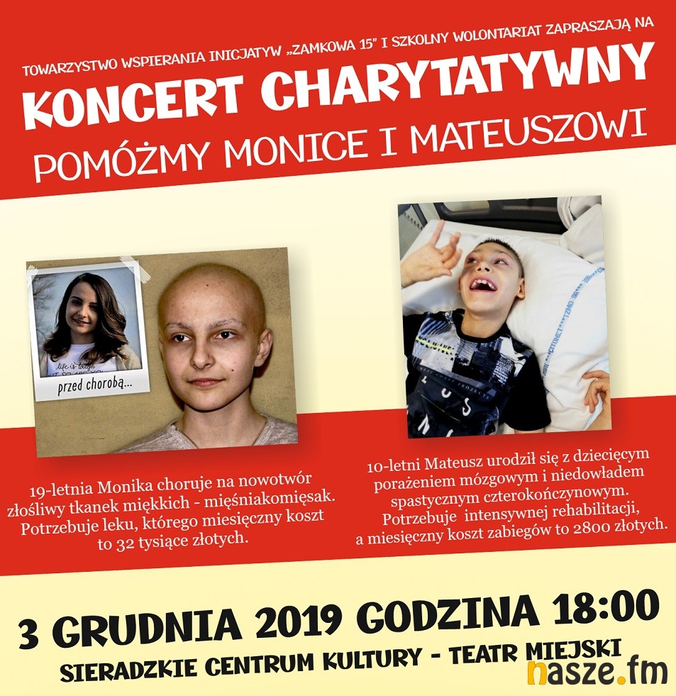 Monice i Matuszowi będzie też można pomóc podczas koncertu charytatywnego. Pomysł takiej formy wsparcia narodził się wśród wolontariuszy działających w Zespole Szkół Ponadgimnazjalnych nr 2 w Sieradzu. Koleżanki Moniki zaproponowały zorganizowanie koncertu dla niej i dla 10-letniego Mateusza, dla którego Szkolny Wolontariat od 5 lat zbiera plastikowe zakrętki. Dzięki Towarzystwu Wspierania Inicjatyw "Zamkowa 15", Szkolnemu Wolontariatowi, ZSP nr 2, Sieradzkiemu Centrum Kultury i Agencji Artystyczno - Reklamowej "Punkt" koncert odbędzie się 3 grudnia 2019 r. o godzinie 18:00 w Teatrze Miejskim w Sieradzu. Nasze Radio objęło to wydarzenie patronatem medialnym.