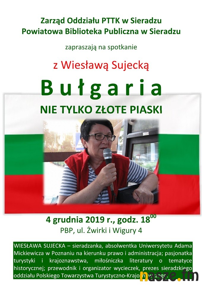 Jeśli chodzi o grudniowe spotkania w PBP to w środę 4 grudnia gościem biblioteki będzie Wiesława Sujecka. Prezes sieradzkiego oddziału Polskiego Towarzystwa Turystyczno-Krajoznawczego opowie o Bułgarii.