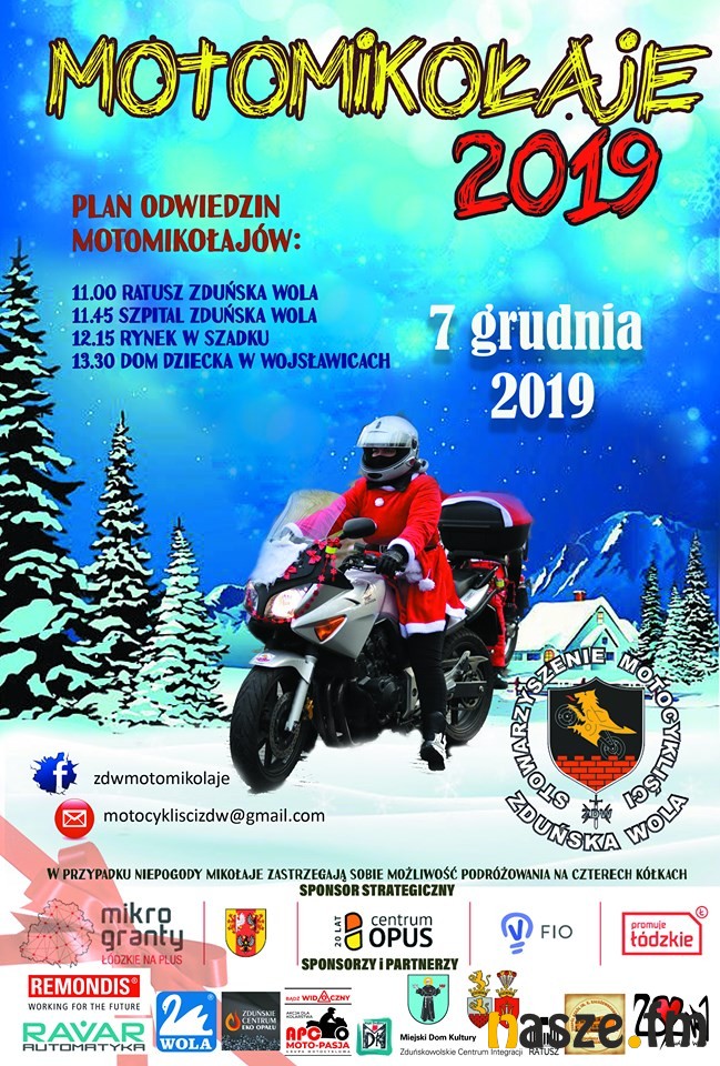 Jutro, 7 grudnia, o godz. 11:00 przed Zduńskowolskim Centrum Integracji - Ratusz pojawią się Motomikołaje, którzy na swoich dwukołowcach przywiozą prezenty dla dzieci. Organizatorem akcji jest Stowarzyszenie Motocykliści Zduńska Wola.